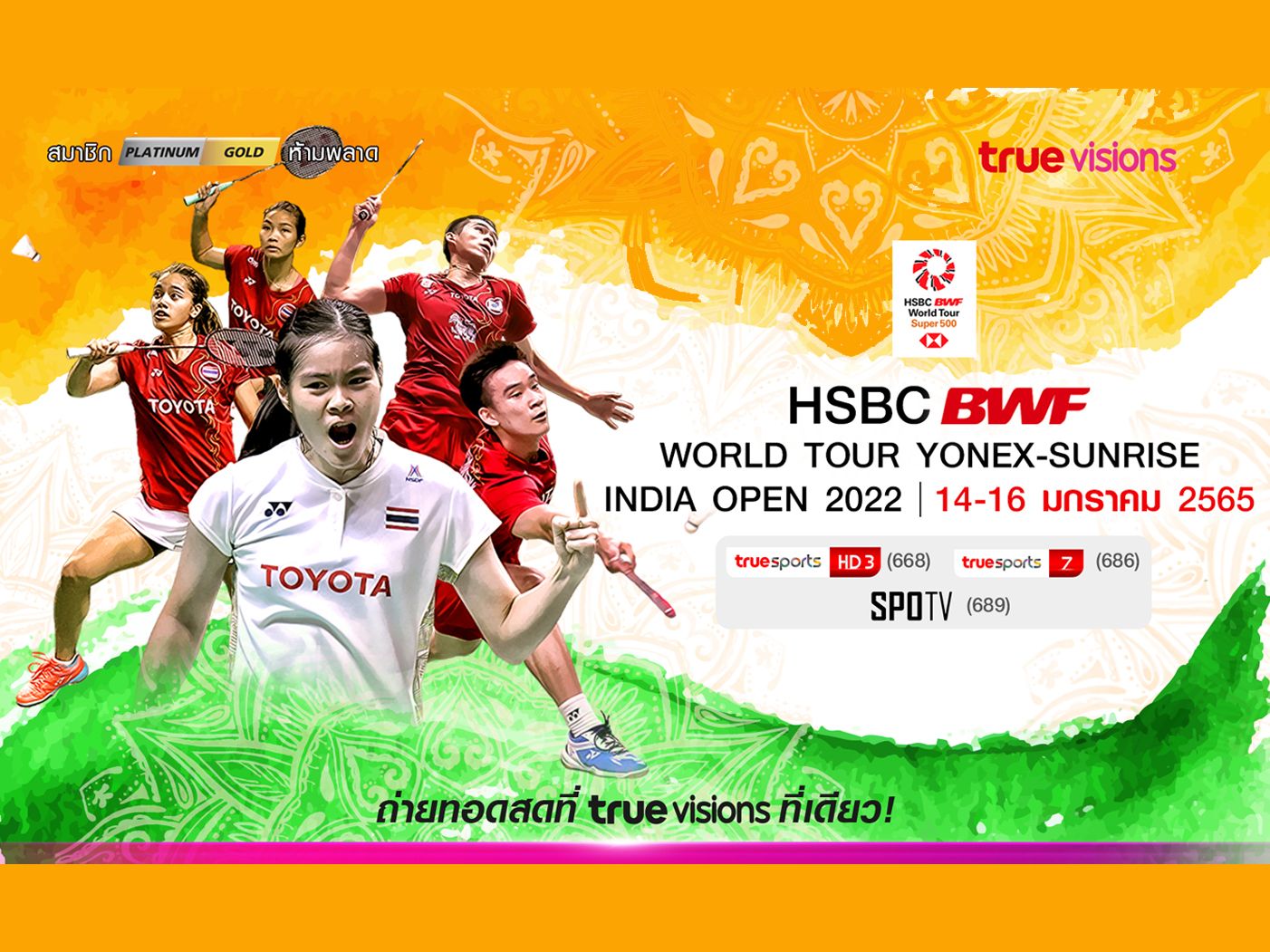 ติดตามการถ่ายทอดสด เเบดมินตัน เวิลด์ทัวร์ 500 รายการ "อินเดีย โอเพ่น 2022" ได้ทาง "ทรูวิชั่นส์" เเละ "ทรูสปอร์ต ตั้งเเต่วันที่ 14-16 มกราคมนี้ โดยเลือกชมได้ทั้ง ทรูสปอร์ต เอชดี 3, ทรูสปอร์ต 7 เเละ สโปทีวี