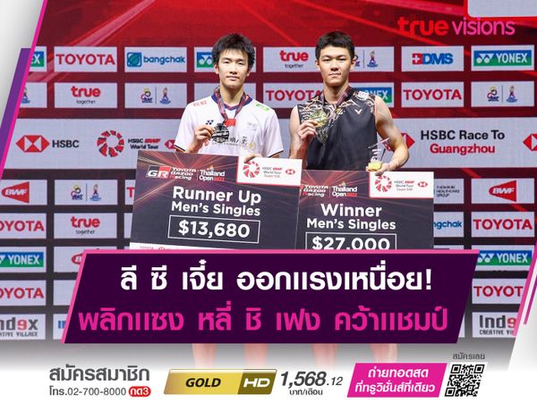 ลี ซี เจี๋ย ครองตำแหน่งแชมป์ชายเดี่ยว "ไทยแลนด์ โอเพ่น" พร้อมรับเงินรางวัล 27,000 เหรียญสหรัฐ หรือประมาณ 1,215,000 บาท ส่วนรองแชมป์ หลี่ ชิ เฟง รับเงินรางวัล 13,680 เหรียญสหรัฐ ประมาณ 615,600 บาท