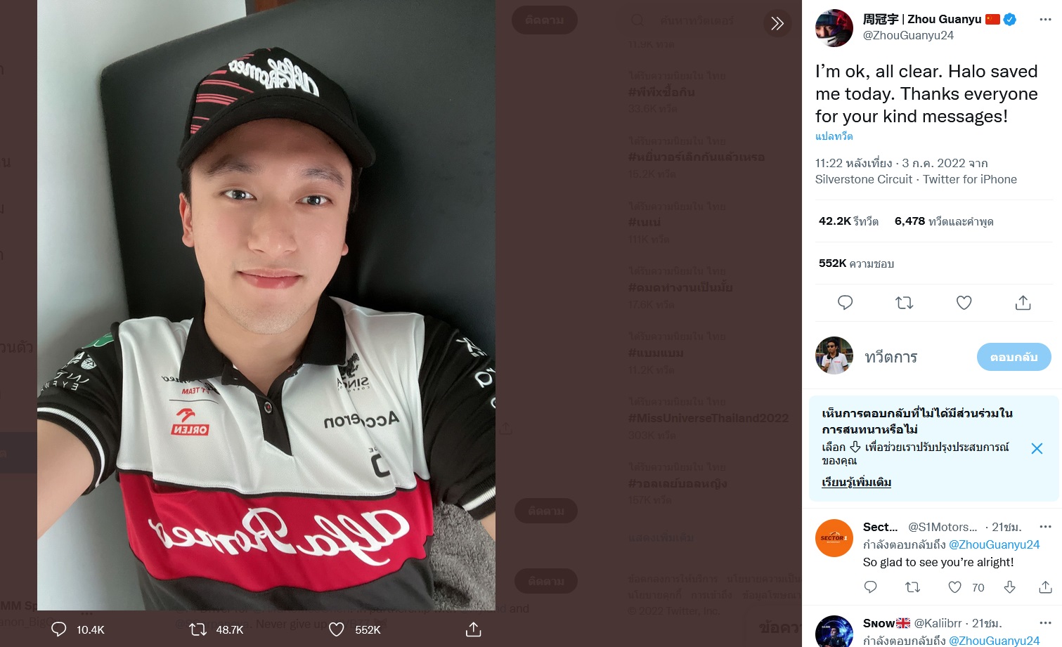หลังเหตุการณ์เฉียดตายของ โจว กวน ยู นักขับ F1 ชาวจีน สังกัดทีมอัลฟา โรเมโอ ที่ประสบอุบัติเหตุในศึก บริติช กรังด์ปรีซ์ เมื่อค่ำวันอาทิตย์ที่ผ่านมา (3 ก.ค. 65)