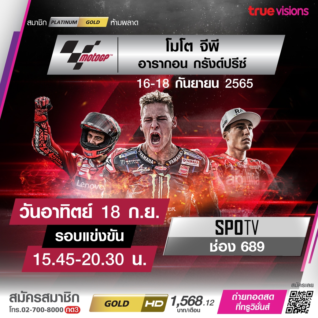 ศึกโมโตจีพี อารากอน กรังด์ปรีซ์ ที่สังเวียน มอเตอร์แลนด์ อารากอน ประเทศสเปน ลุ้นชมกันในรอบแข่งขัน พร้อมกับส่งใจเชียร์ ก้อง สมเกียรติ จันทรา ในรุ่นโมโต 2 ชมสด ครบทุกรุ่น ทาง ทรูวิชั่นส์