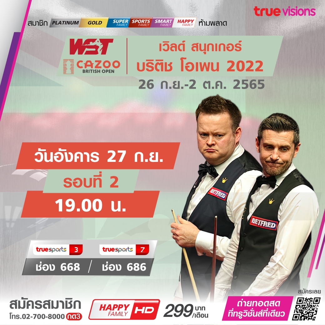 วันนี้มีอะไรดูที่ ทรูวิชั่นส์ ประจำวันอังคารที่ 25 กันยายน 2565 ยังคงมีศึกสนุกเกอร์รายการใหญ่อย่าง บริติช โอเพ่น ซึ่งเดินทางมาถึงรอบที่สองของการแข่งขันแล้ว โดย ทรูวิชั่นส์ ยิงสด ให้ได้ชมกันถึงบ้าน