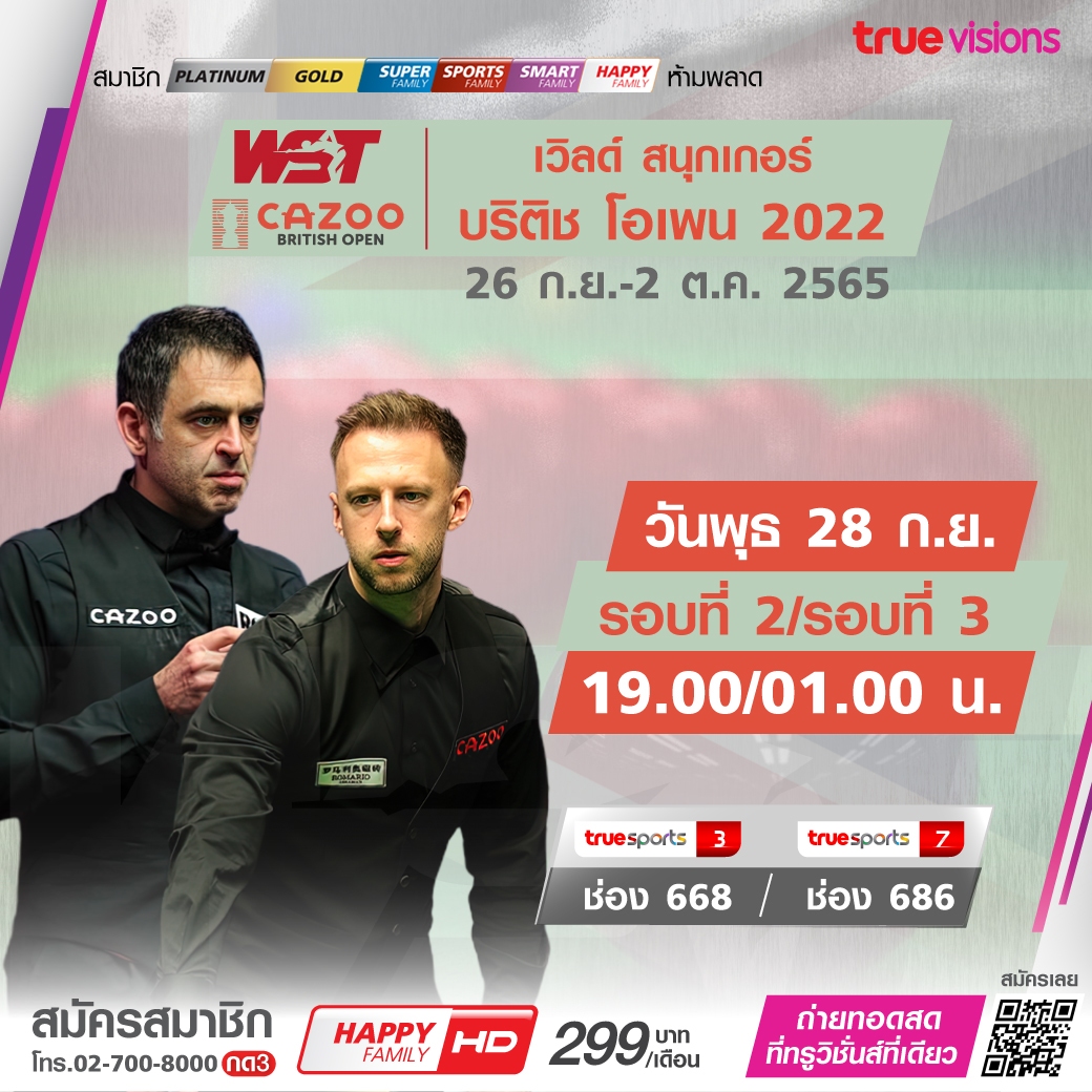 วันนี้มีอะไรดูที่ ทรูวิชั่นส์ ประจำวันพุธที่ 28 กันยายน 2565 ยังคงมีศึกสนุกเกอร์รายการใหญ่อย่าง บริติช โอเพ่น ซึ่งเดินทางมาถึงรอบที่ 3 ของการแข่งขันแล้ว โดย ทรูวิชั่นส์ ยิงสด ให้ได้ชมกันถึงบ้าน