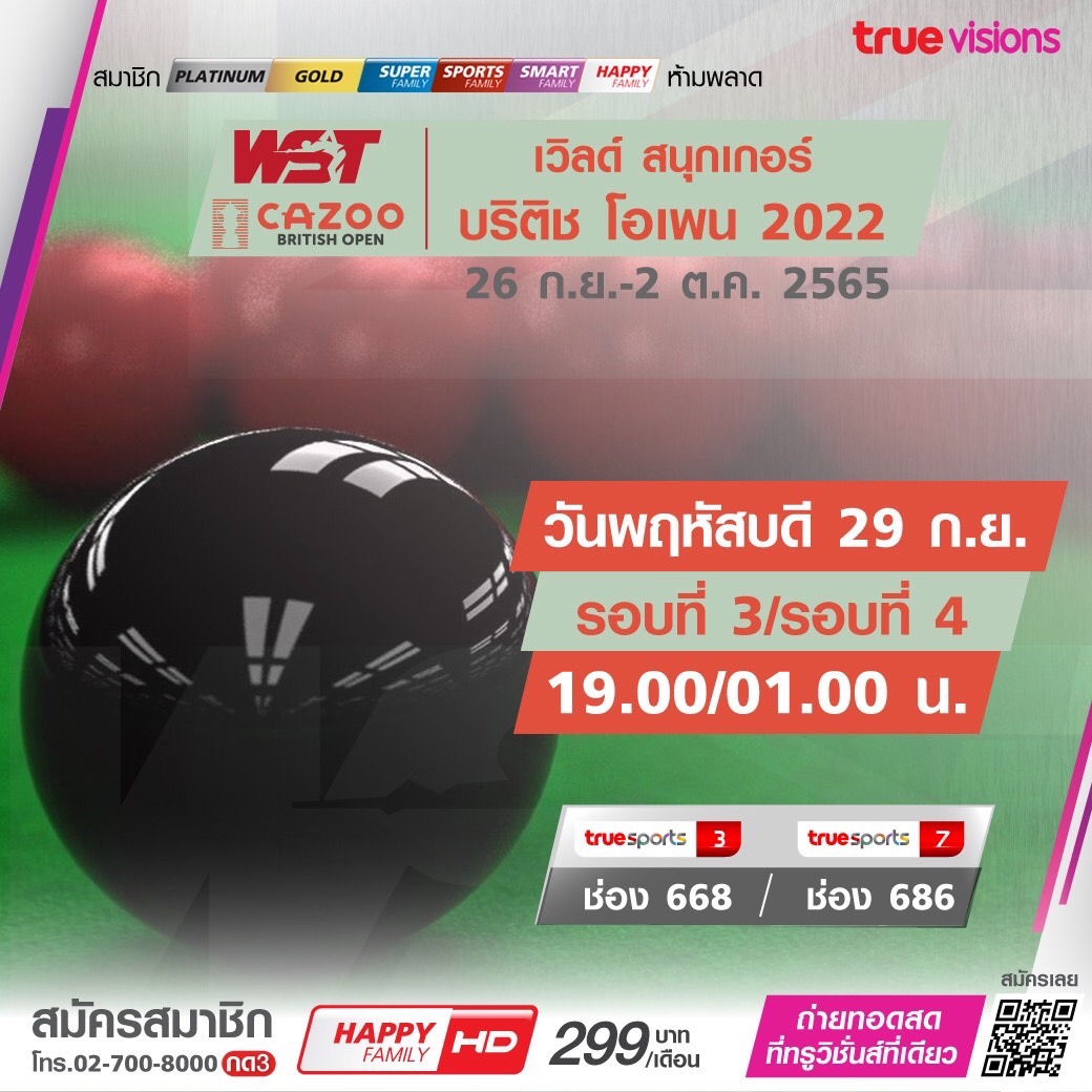 สนุกเกอร์เก็บคะแนนสะสมโลก บริติช โอเพ่น ชมกันจุใจในรอบที่ 3 ต่อด้วยรอบที่ 4 ใครจะได้แชมป์และชูถ้วย ไคล์ฟ เอฟเวอร์ตัน โทรฟี่ ในวันสุดท้าย ชมสด ทางทรูวิชั่นส์ ที่เดียว