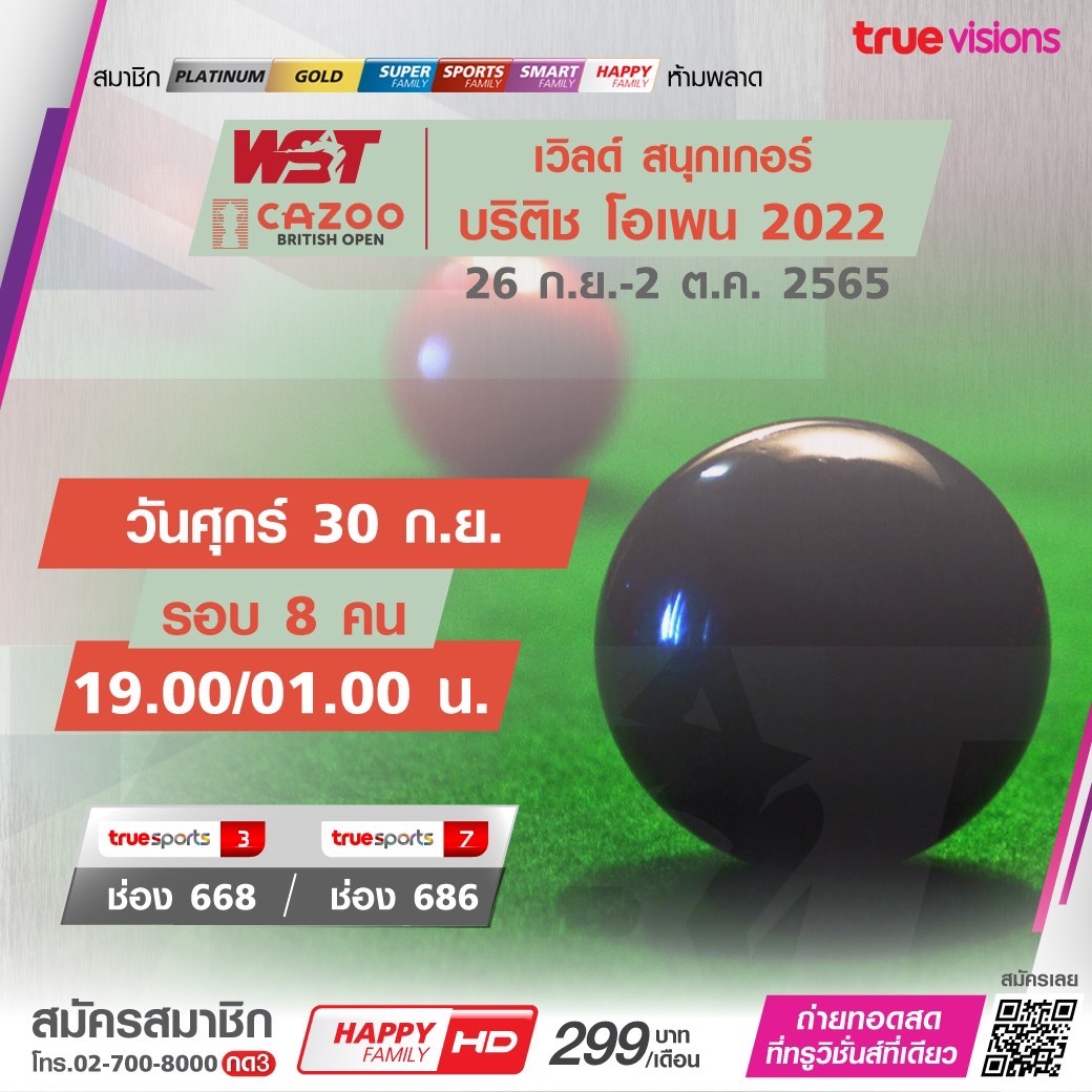สนุกเกอร์เก็บคะแนนสะสมโลกรายการ บริติช โอเพ่น เข้าสู่รอบ 8 คนสุดท้าย ใครจะได้แชมป์และชูถ้วย ไคล์ฟ เอฟเวอร์ตัน โทรฟี่ ในวันสุดท้าย ชมสด ทางทรูวิชั่นส์ ที่เดียว