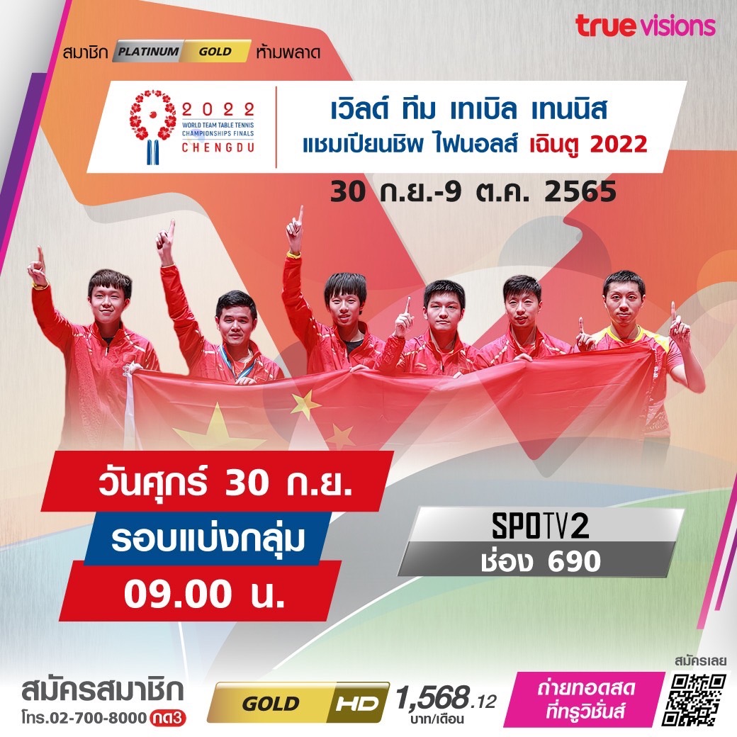แฟนๆ เทเบิลเทนนิส เตรียมเฮ!! ศึกใหญ่ระดับโลกที่จะระเบิดขึ้นที่เมืองเฉิงตู ประเทศจีน กับรายการ เวิลด์ ทีม เทเบิล เทนนิส แชมเปี้ยนชิพ ไฟนอลส์ 2022 สดจุใจ ทั้งทีมชายและทีมหญิง ตั้งแต่รอบแบ่งกลุ่ม ถึงรอบชิงฯ ชมสด ทางทรูวิชั่นส์