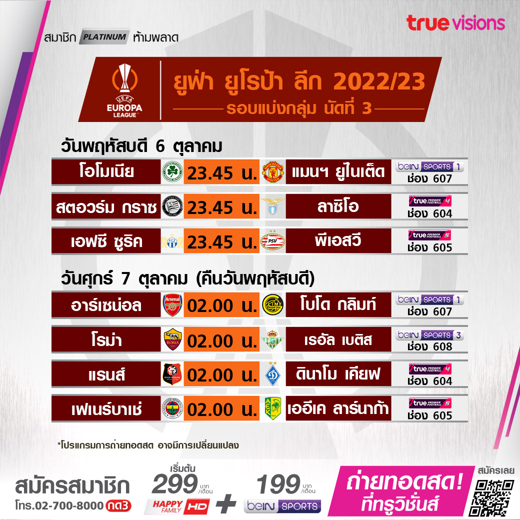 วันนี้มีอะไรดูที่ ทรูวิชั่นส์ ประจำวันพฤหัสบดีที่ 6 ตุลาคม 2565 ยังมีศึกฟุตบอลถ้วยยุโรปอย่าง ยูฟ่า ยูโรป้า ลีก และ ยูโรป้า คอนเฟอเรนซ์ ลีก ในรอบแบ่งกลุ่มให้ได้ติดตามกันต่อ นอกจากนี้ยังมีศึกเทนนิสหญิง ดับเบิ้ลยูทีเอ ทัวร์ รายการ ออสตราว่า โอเพ่น, กอล์ฟ พีจีเอ ทัวร์ รายการ ไชรเนอร์ ชิลเดรนส์ โอเพ่น, กอล์ฟหญิงแอลพีจีเอ ทัวร์ รายการ เมดิฮีล แชมเปี้ยนชืพ, ศึกเทเบิลเทนนิส รายการระดับโลก เวิลด์ ทีม เทเบิลเทนนิส แชมเปี้ยนชิพ ไฟนอลส์ 2022 และ อมเริกันฟุตบอล เอ็นเอฟแอล ซึ่ง ทรูวิชั่นส์ จัดเต็ม ยิงสดให้ชมกันถึงบ้าน