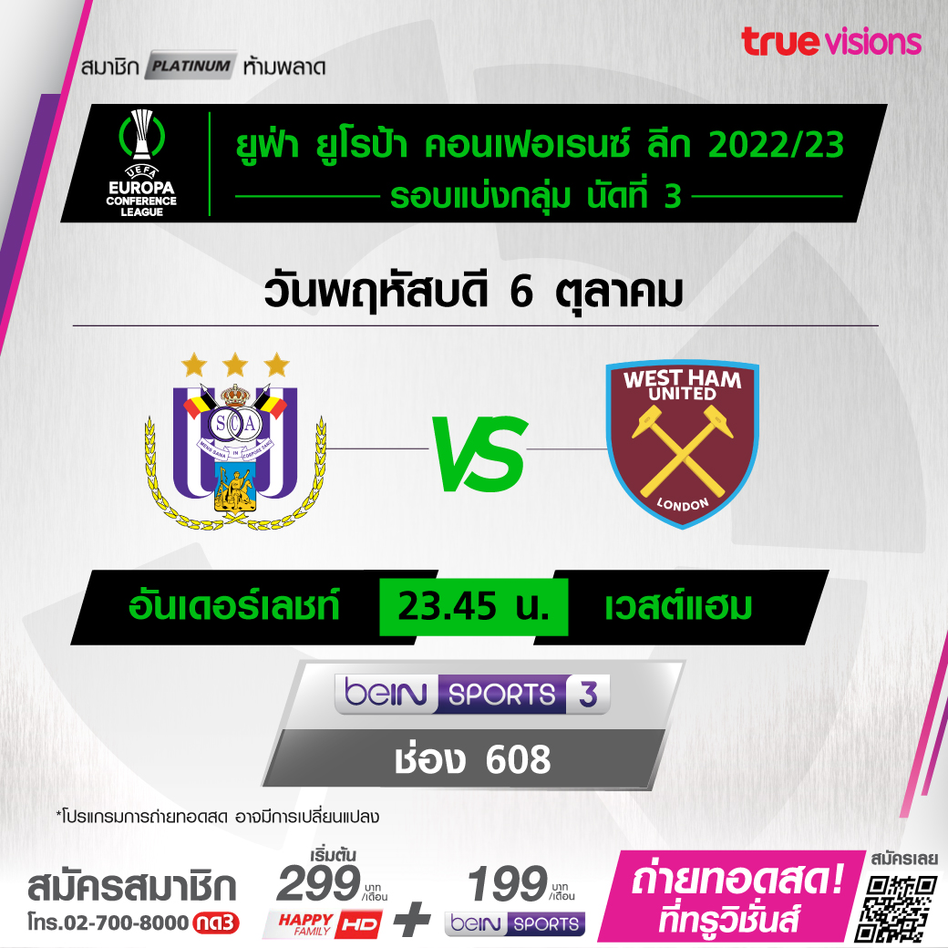 Anderlecht vs. West Ham เวลา 23.45-01.45 ทางช่อง beIN Sports 3 (608)