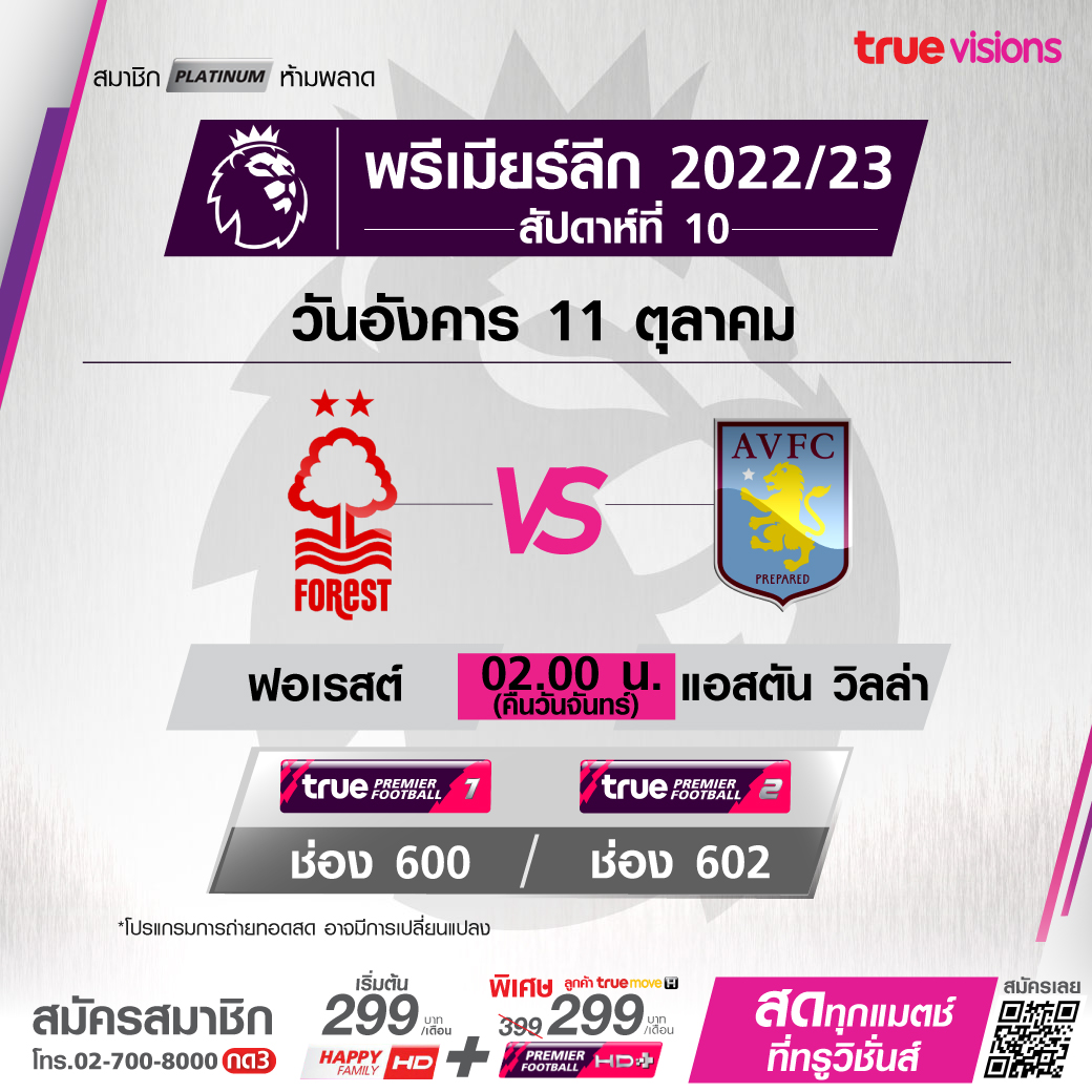 Forest vs. Aston Villa เวลา 02.00-04.00 ทางช่อง TPF 1 (600) / TPF 2 (602)