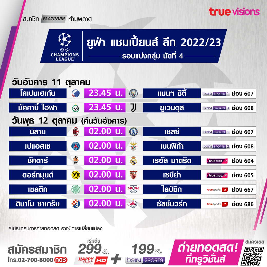 วันนี้มีอะไรดูที่ ทรูวิชั่นส์ ประจำวันอังคารที่ 11 ตุลาคม 2565 ไฮไลท์อยู่ที่ศึก ยูฟ่า แชมเปี้ยนส์ ลีก รอบแบ่งกลุ่ม ซึ่งเดินทางมาถึงเกมที่ 4 แล้ว โดยมีคู่บิ๊กแมตช์ให้ได้ติดตามชมกันอย่างมากมาย นอกจากนี้ยังมีศึกเทนนิสหญิง ดับเบิ้ลยูทีเอ ทัวร์ รายการ ซาน ดิเอโก้ โอเพ่น โดยงานนี้ ทรูวิชั่นส์ จัดเต็ม ยิงสดให้ชมกันถึงบ้าน