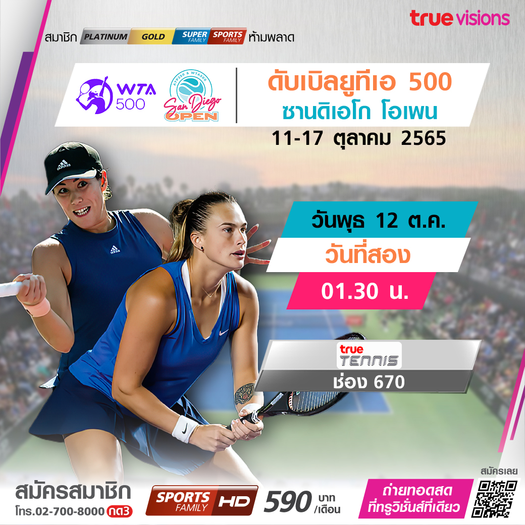 เทนนิสหญิง ซาน ดิเอโก้ โอเพ่น รายการสำคัญระดับ 500 ซีรีส์ มือระดับท็อป 20 ของโลกมาร่วมดวลถึง 16 คน นำโดยหมายเลข 1 ของโลกคนปัจจุบัน การแข่งขันในวันที่สอง สดครบทุกรอบ ชมสด ทางทรูวิชั่นส์ ที่เดียว