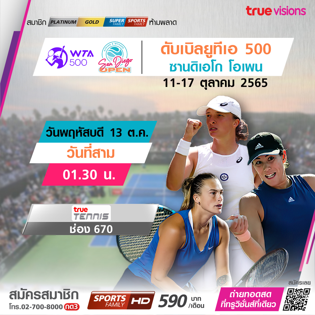เทนนิสหญิง ซาน ดิเอโก้ โอเพ่น รายการสำคัญระดับ 500 ซีรีส์ มือระดับท็อป 20 ของโลกมาร่วมดวลถึง 16 คน นำโดยหมายเลข 1 ของโลกคนปัจจุบัน การแข่งขันในวันที่สาม สดครบทุกรอบ ชมสด ทางทรูวิชั่นส์ ที่เดียว