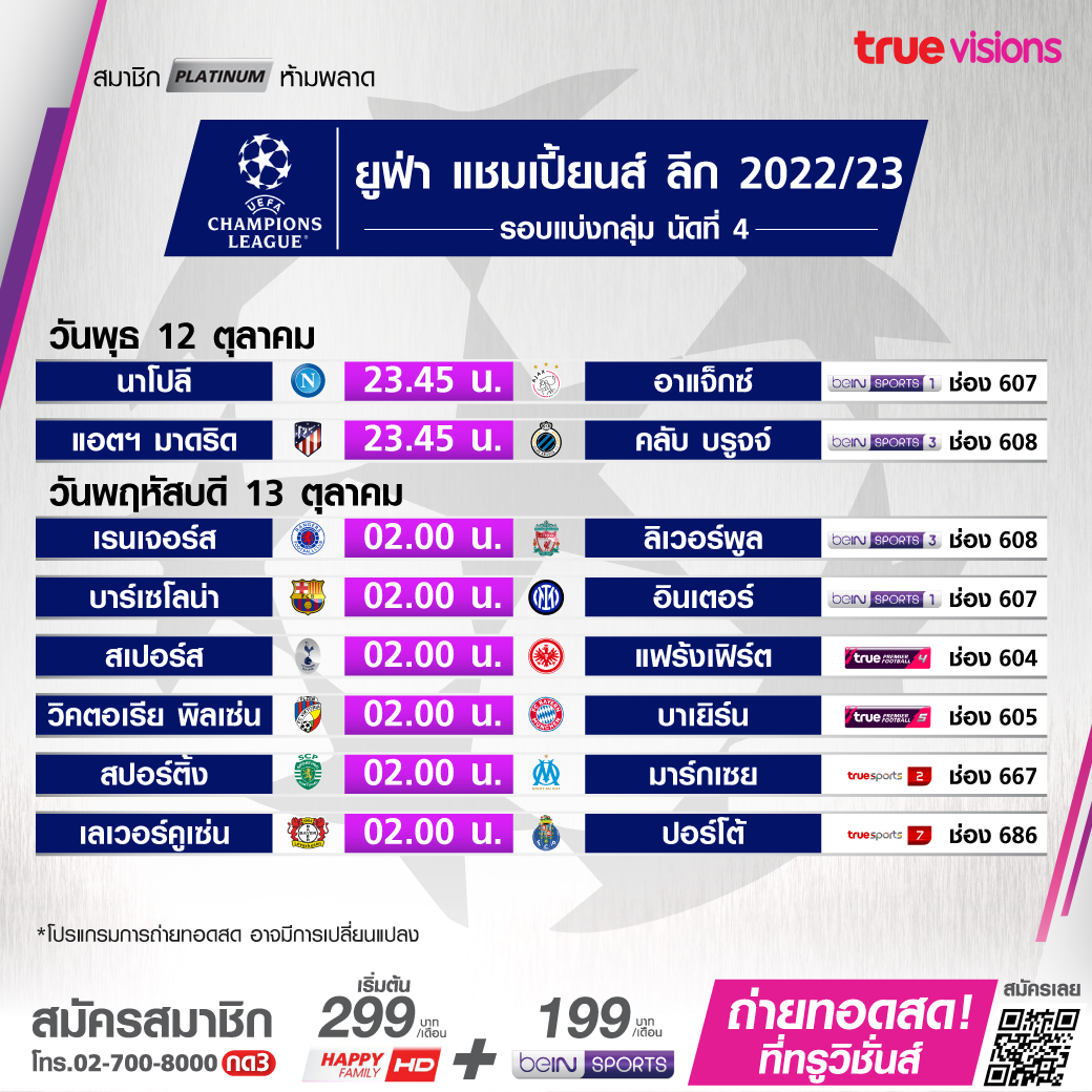 วันนี้มีอะไรดูที่ทรูวิชั่นส์ ประจำวันพุธที่ 12 ตุลาคม 2565 ไฮไลท์ยังอยู่ที่ศึก ยูฟ่า แชมเปี้ยนส์ ลีก รอบแบ่งกลุ่ม ซึ่งเดินทางมาถึงเกมที่ 4 แล้ว โดยมีคู่บิ๊กแมตช์ให้ได้ติดตามชมกันอย่างมากมาย นอกจากนี้ยังมีศึกเทนนิสหญิง ดับเบิ้ลยูทีเอ ทัวร์ รายการ ซาน ดิเอโก้ โอเพ่น โดยงานนี้ ทรูวิชั่นส์ จัดเต็ม ยิงสดให้ชมกันถึงบ้าน