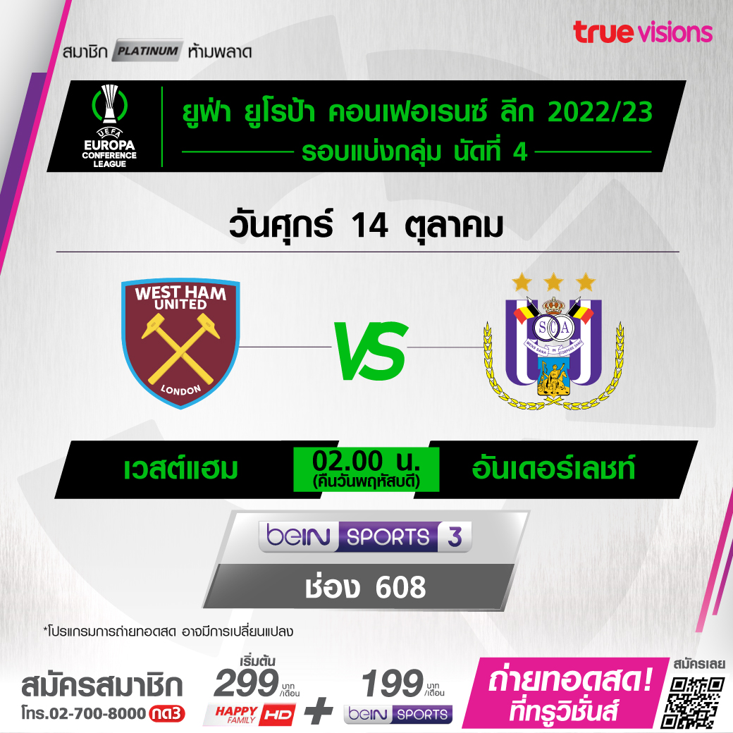 West Ham vs. Anderlecht เวลา 02.00-04.00 ทางช่อง beIN Sports 3 (608)