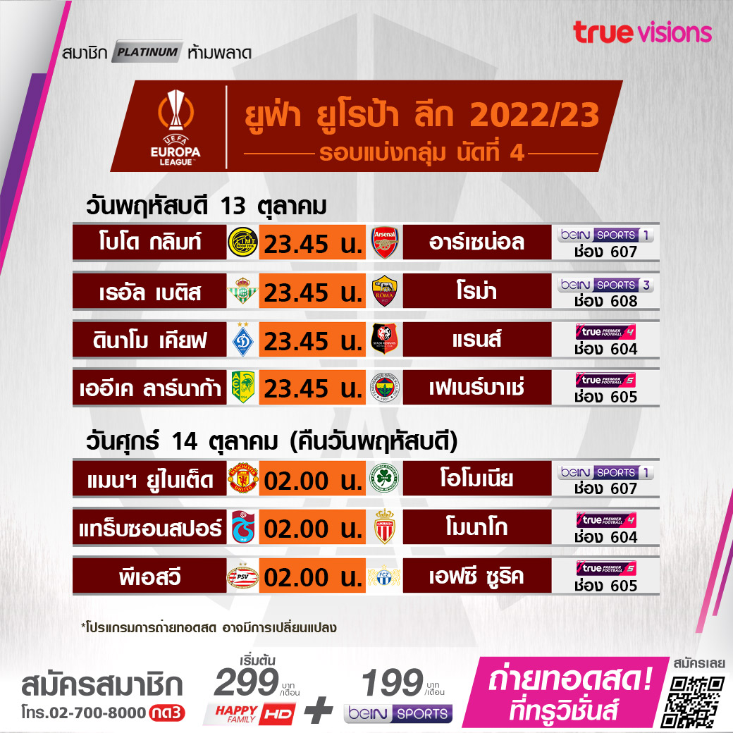 วันนี้มีอะไรดูที่ ทรูวิชั่นส์ ประจำวันพฤหัสบดีที่ 13 ตุลาคม 2565 ในส่วนของฟุตบอลยังคงมีศึก ยูฟ่า ยูโรป้า ลีก และ คอนเฟอเรนซ์ ลีก ในรอบแบ่งกลุ่มให้ได้ติดตามกันอย่างต่อเนื่อง นอกจากนี้ยังมีศึกโมโต จีพี รายการออสเตรเลียน กรังด์ปรีซ์, กอล์ฟพีจีเอ ทัวร์ รายการ โซโซ่ แชมเปี้ยนชิพ, กอล์ฟหญิง เลดี้ส์ ยูโรเปี้ยน ทัวร์ อารามโก้ ทีมซีรี่ส์, ศึกเทนนิสหญิง ดับเบิ้ลยูทีเอ ทัวร์ รายการ ซาน ดีเอโก้ โอเพ่น และศึกอเมริกันฟุตบอล เอ็นเอฟแอล งานนี้ ทรูวิชั่นส์ จัดเต็ม ยิงสดให้ชมกันถึงบ้าน