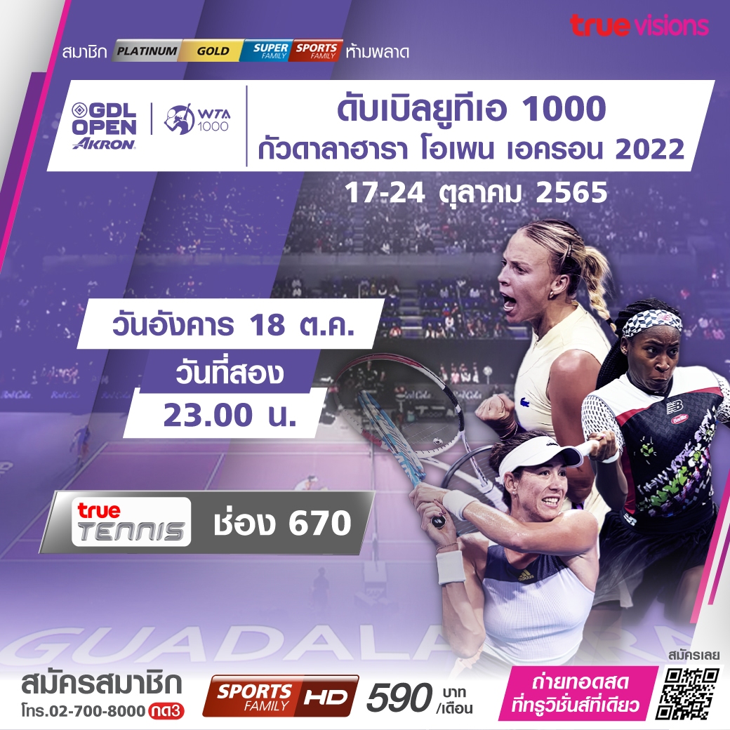 นักเทนนิสสาวดวลกันสนั่นแดนจังโก้ สัปดาห์นีั ดับเบิลยูทีเอ ทัวร์ รายการใหญ่ ระดับ 1000 ซีรี่ส์ กวาดาลาฮาร่า โอเพ่น เอครอน มือระดับท็อป 20 ของโลกมาร่วมลุ้นแชมป์กว่า 17 คน ใครจะคว้าแชมป์ ใครจะไปต่อในรายการปิดท้ายปี ดับเบิ้ลยูทีเอ ไฟนอลส์ ชมสด ทางทรูวิชั่นส์ ที่เดียว