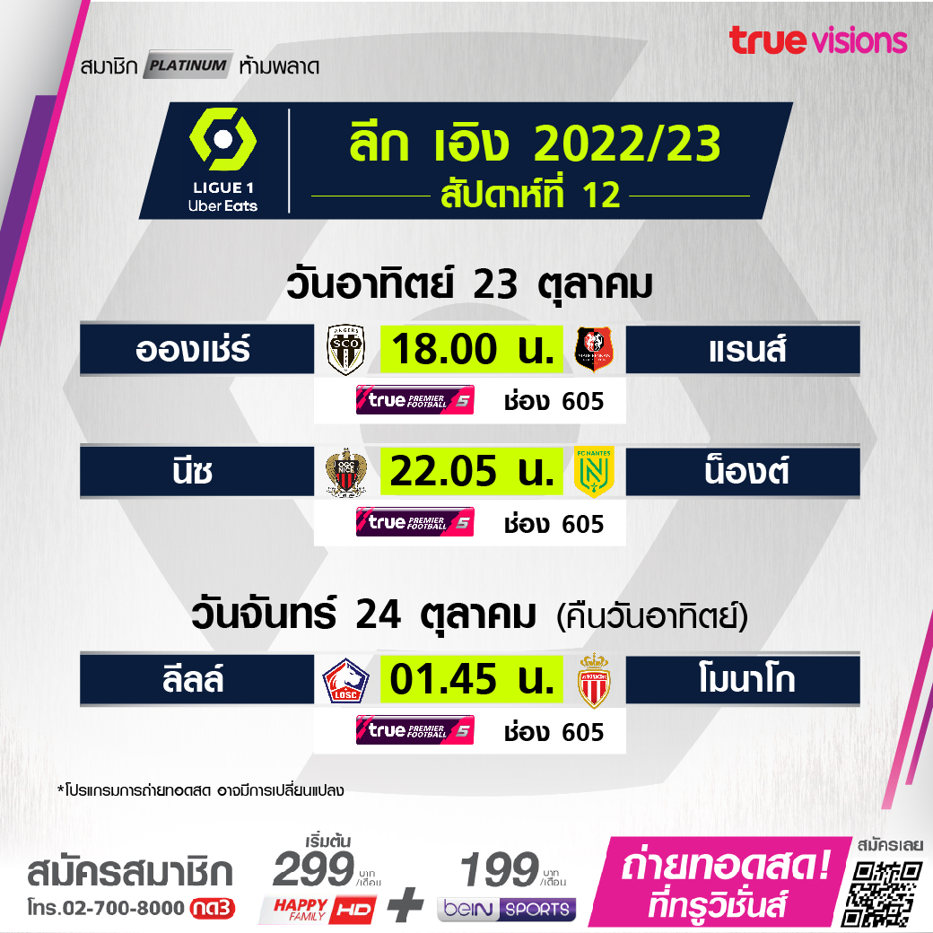 Nice vs. Nantes เวลา 22.05-00.05 ทางช่อง TPF 5 (605)