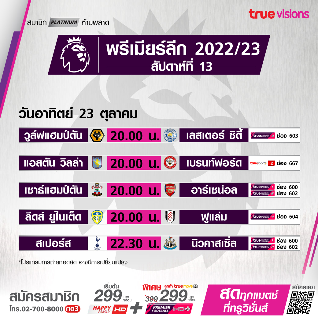 วันนี้มีอะไรดูที่ ทรูวิชั่นส์ ประจำวันอาทิตย์ที่ 23 ตุลาคม 2565 อัดแน่นไปด้วยกีฬาชั้นนำระดับโลกมากมาย ไม่ว่าจะเป็นศึกฟุตบอลลีกยุโรปอย่าง พรีเมียร์ลีก อังกฤษ, กัลโช่ เซเรีย อา อิตาลี, ลา ลีกา สเปน และ ลีก เอิง ฝรั่งเศส นอกจากนี้ยังมีศึกฟอร์มูล่า วัน รายการ ยูเอส กรังด์ปรีซ์ และ โมโต จีพี รายการ มาเลเซียน กรังด์ปรีซ์ ขณะที่กีฬาที่น่าสนใจอื่นๆ ยังมีกอล์ฟพีจีเอ ทัวร์ รายการ เดอะ ซีเจ คัพ, กอล์ฟหญิงแอลพีจีเอ ทัวร์ รายการ บีเอ็มดับเบิ้ลยู เลดี้ส์ แชมเปี้ยนชิพ, ศึก เวิลด์ สนุกเกอร์ นอร์ธเทิร์น ไอร์แลนด์ โอเพ่น, เทนนิสหญิง ดับเบิ้่ลยูทีเอ ทัวร์ 1000 ซีรี่ส์ รายการ กวากาลาฮาร่า โอเพ่น, แบดมินตัน บีดับเบิ้ลยูเอฟ 750 รายการเดนมาร์ก โอเพ่น รวมถึงศึกเทเบิลเทนนิส ในรายการ เวิลด์ เทเบิลเทนนิส แชมเปี้ยนส์ มาเก๊า และศึกอเมริกันฟุตบอล เอ็นเอฟแอล งานนี้ ทรูวิชั่นส์ จัดเต็ม ยิงสดให้ชมกันถึงบ้าน