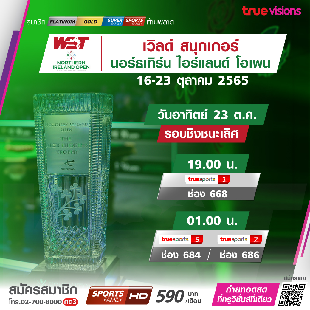 สนุกเกอร์เก็บคะแนนสะสมโลก นอร์ธเทิร์น ไอร์แลนด์ โอเพ่น 2022 ที่ กรุงเบลฟาสต์ ไอร์แลนด์เหนือ เข้าสู่รอบชิงชนะเลิศ ใครจะได้ชูถ้วย อเล็กซ์ ฮิกกินส์ โทรฟี่ เชียร์กันสดๆ ทางทรูวิชั่นส์ ที่เดียว