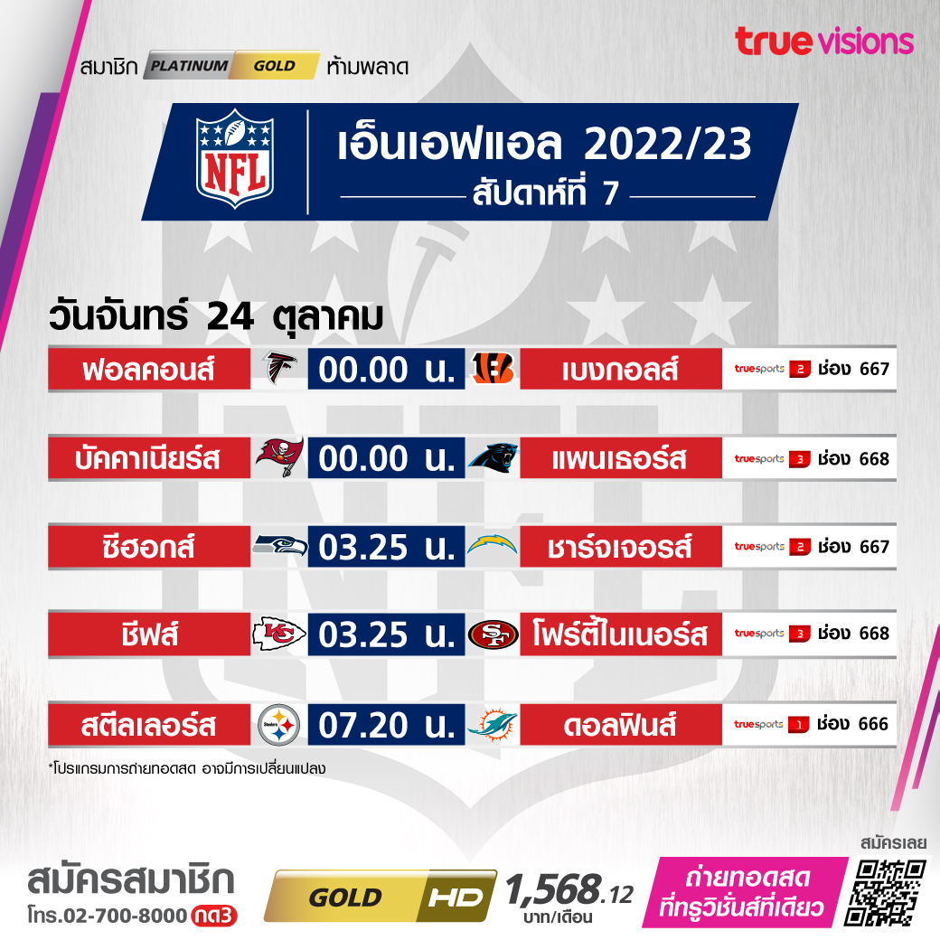 วันจันทร์ 24 Seahawks vs. Chargers เวลา 03.25-06.45 ทางช่อง TS2 (667)