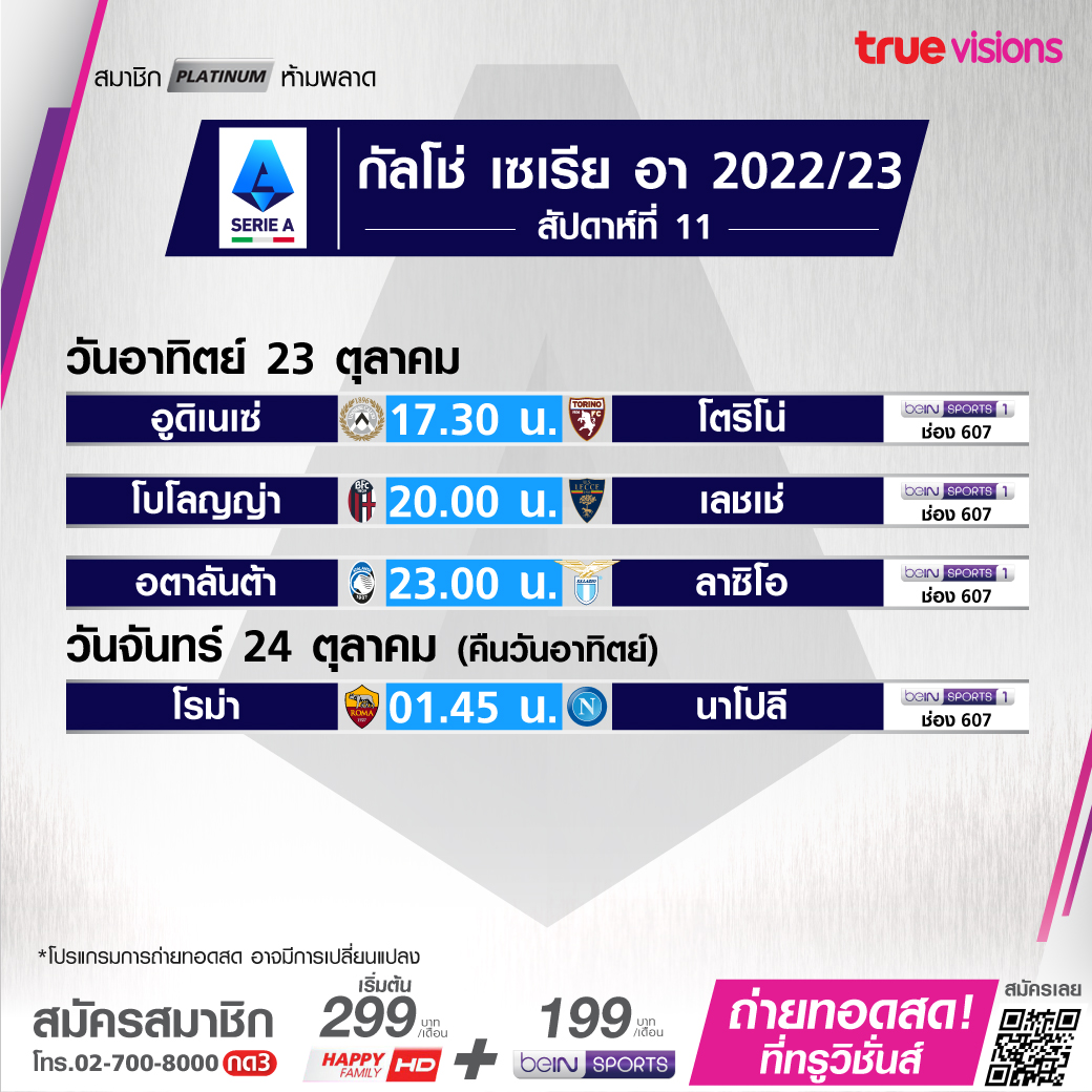 Atalanta vs. Lazio เวลา 23.00-01.00 ทางช่อง beIN Sports 1 (607)