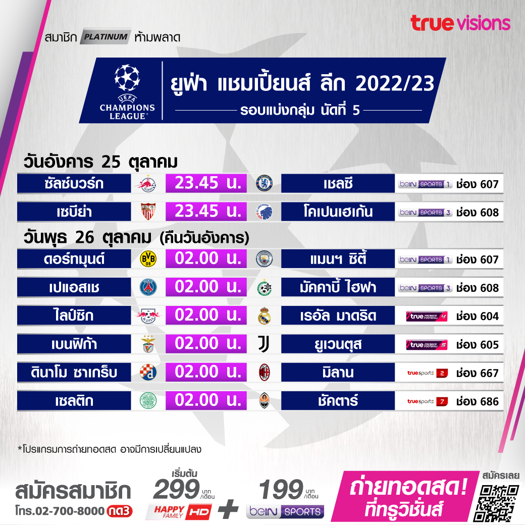 วันนี้มีอะไรดูที่ ทรูวิชั่นส์ ประจำวันอังคารที่ 25 ตุลาคม 2565 ไฮไลท์วันนี้อยู่ที่ศึก ยูฟ่า แชมเปี้ยนส์ ลีก รอบแบ่งกลุ่ม ซึ่งเดินทางมาถึงเกมที่ 5 แล้ว โดยมีหลายคู่ที่น่าสนใจ และมีทีมใหญ่ลงเตะมากมาย งานนี้ ทรูวิชั่นส์ จัดเต็ม ยิงสดให้ชมกันถึงบ้าน