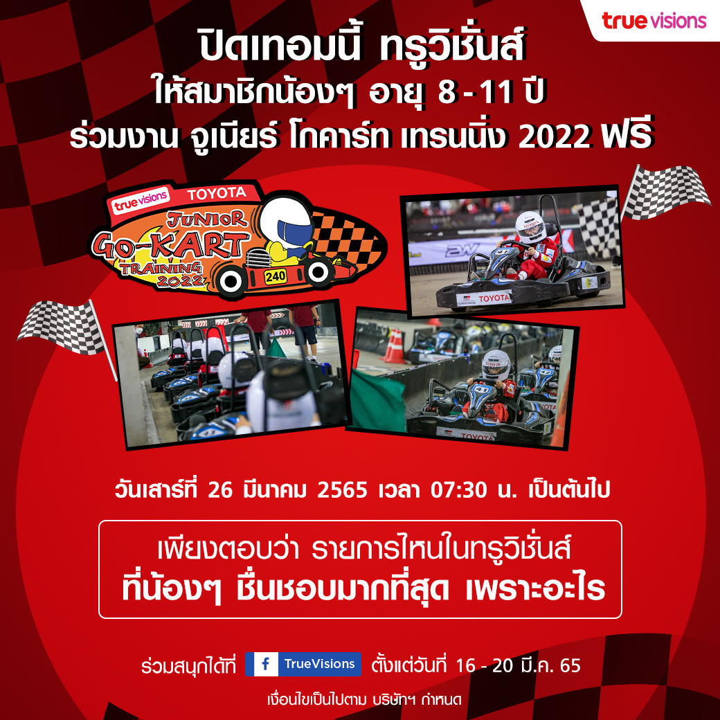 ปิดเทอมนี้ ทรูวิชั่นส์ให้สมาชิกน้องๆ อายุ 8 – 11 ปี ร่วมงาน จูเนียร์ โกคาร์ท เทรนนิ่ง 2022 ฟรี!! ประสบการณ์นอกห้องเรียน เรียนรู้กฎกติกาจราจร กับการขับรถโกคาร์ทให้สนุกและปลอดภัย พิเศษพร้อมรับชุดนักแข่ง และหมวกนิรภัย ณ สนามรถคาร์ทในร่ม ชั้น 2 อาร์ซีเอ พลาซ่า ถนนพระราม 9 วันเสาร์ที่ 26 มีนาคม 2565 เวลา 07:30 น. เป็นต้นไป